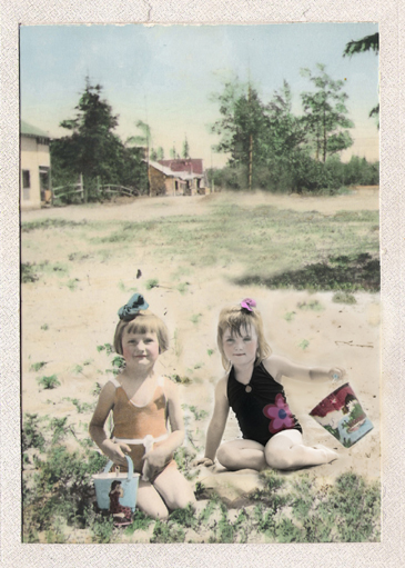 I’m a total hack with Photoshop and I just kept hacking at it till I thought it looked right-ish. I had to blend the low-resolution sand from 1938 with the high-resolution sand from 2010. Hazel’s & Jeanette’s eyes are the same colour so I had to lighten her eyes.